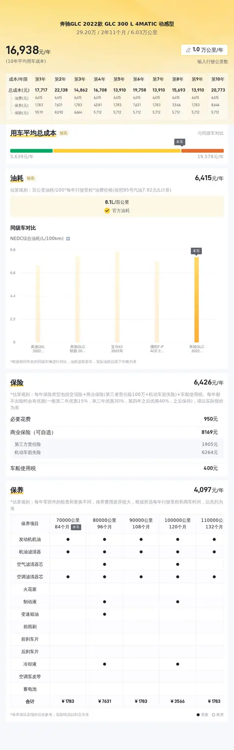 经过懂车帝的大数据分析,这款奔驰GLC 2022款 GLC 300 L 4MATIC 动感型的10年平均用车成本约17180元/年,与同级别车相比处于中等偏上水平。具体用车成本还要根据车辆的使用情况、保养情况、油价等因素而定。