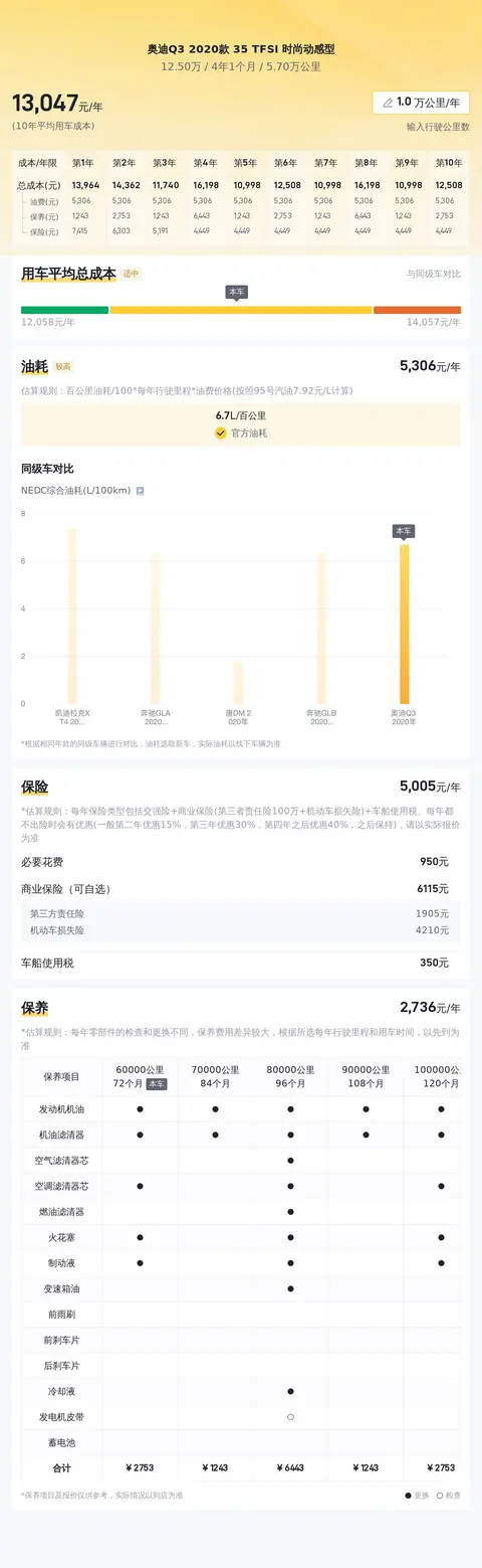这辆车的用车成本我们为您估算了一下,根据估算,奥迪Q3 2020款 35 TFSI 时尚动感型的年均综合用车成本约13345元,这样的花费并不是很高。