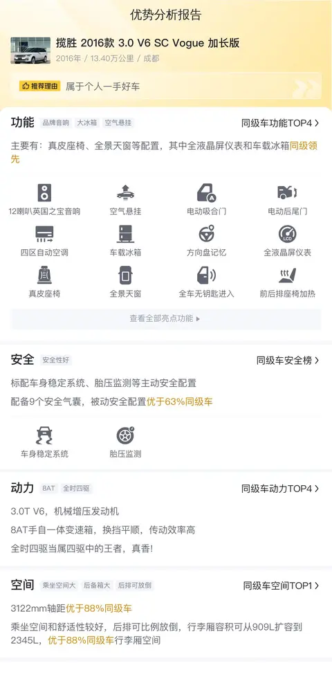 这是一辆2016年5月上牌的揽胜 2016款 3.0 V6 SC Vogue 加长版,上牌地为四川成都,表显里程13.4万公里,白色车身。该车目前未有过户记录。新车指导价为162.8万元,现卖家报价53.8万元。