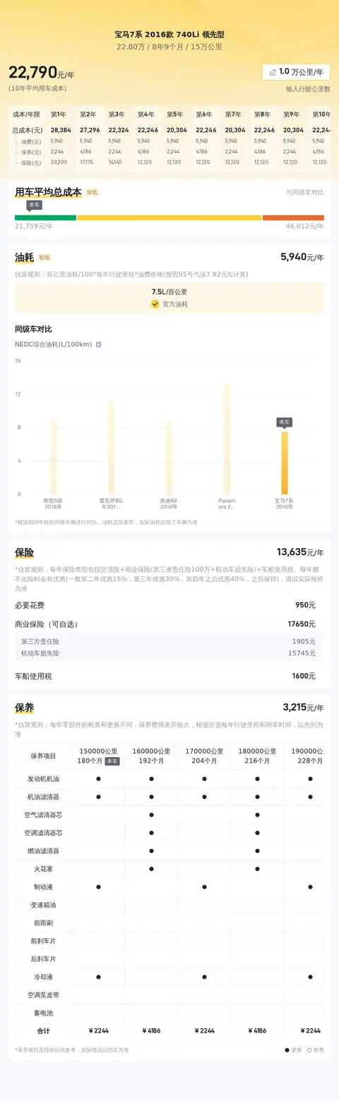 在用车成本方面,根据估算,这辆宝马7系的年均综合用车成本约为2.3万元。考虑到其新车指导价高达118.8万元,这样的用车成本可以说是相当合理的。当然,具体的用车成本还需要根据车主的驾驶习惯、用车环境等因素来决定。