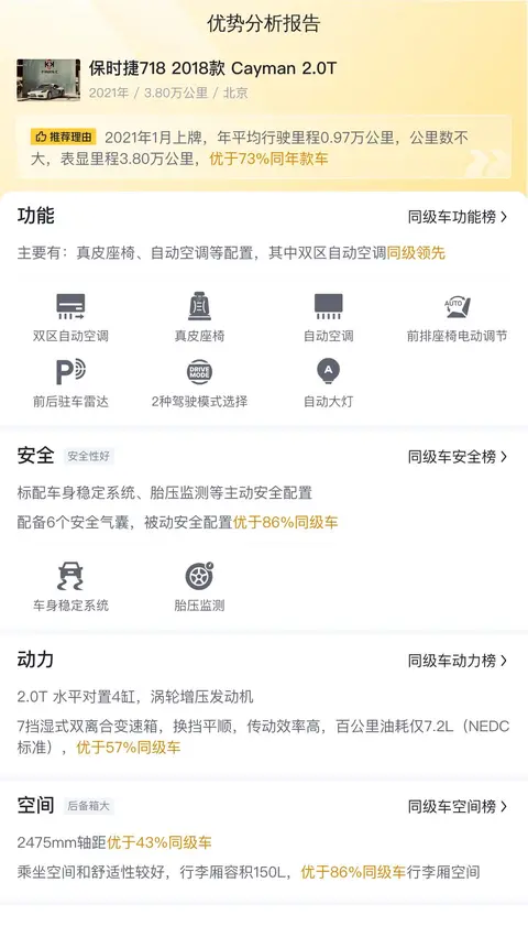 保时捷718(图片|配置|询价)是保时捷推出的一款入门级跑车,主要面向追求驾驶乐趣和跑车体验的年轻人。它有悠久的历史和传承,其设计理念和技术特点都与经典跑车保时捷550和保时捷718有着千丝万缕的联系。保时捷718在设计上注重轻量化和操控性能,采用了多项先进技术,如水平对置四缸发动机、PTM牵引力管理系统等。它的推出也反映了保时捷对市场需求的把握和对技术创新的追求。今天我们就为您带来一辆二手保时捷718 2018款 Cayman 2.0T,希望可以满足您的需求。
