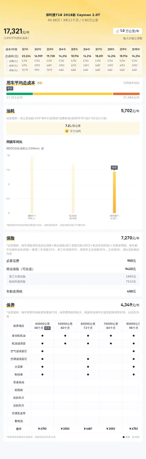 根据大数据预估显示,这辆保时捷718 2018款 Cayman 2.0T的市场价格在37.27万元至45.17万元之间,而当前的报价为40.98万元,处于合理区间内。在用车成本方面,这辆车的年均综合用车成本约为1.7万元,对于一款豪华跑车而言,这一成本并不算高。