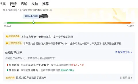 我们购买二手车,肯定要了解这辆车的市场行情,以免花冤枉钱,一般车辆的市场行情价都是根据大数据分析得出的,与新车价没有直接关系。根据大数据分析,该车的市场行情大约在38.5万-47.37万之间,具体售价要看车况如何了。