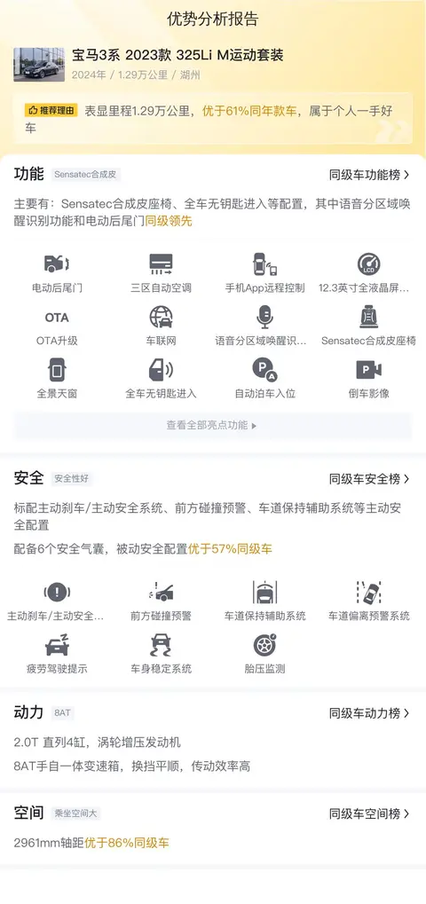 这辆宝马3系 2023款 325Li M运动套装的优势表现在功能配置上,手机APP远程控制和电动后尾门领先同级车,另外,2961mm轴距优于86%同级车,乘坐空间也有保障。