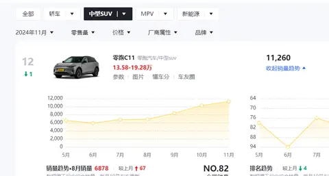 零跑品牌相比于新势力“蔚小理”而言,起步稍晚一些,当然晚不代表什么,只要诚意足,消费者始终会买单的,常言道“是金子总是会发光的”,这句并没有错,零跑汽车近两年的市场表现并不差,零跑C11(图片|配置|询价),C16,C10市场表现都得消费者认可,其中零跑C11(读测评)累计销量突破20万辆,在2024年11月份热销10260台,对于一台新势力而言,取得这样的成绩,实属不易,本期就聊聊该车的产品力。
