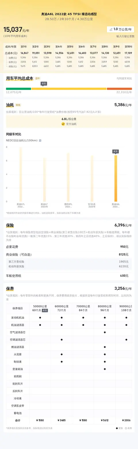 接下来,我们来聊聊大家比较关心的用车成本。根据懂车帝的大数据分析,奥迪A6L 2022款 45 TFSI 臻选动感型的10年平均用车成本约为15,388元/年,这其中包括油费、保养费及保险费。当然,具体费用还是要根据车辆的实际使用情况和保养情况而定。