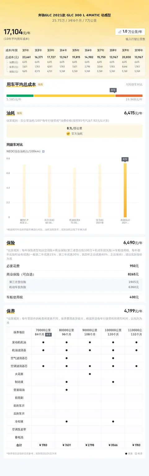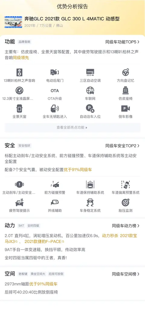 另外,根据懂车帝的大数据分析,奔驰GLC 2021款 GLC 300 L 4MATIC 动感型的保值率为52.82%,而同级车的保值率是46.36%,和同级车相比它的保值率较高。
