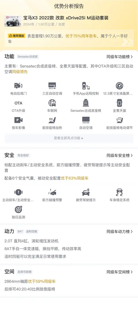 综上所述,这辆宝马X3 2022款 改款 xDrive25i M运动套装在二手车市场中是一辆值得考虑的车型。它不仅拥有宝马品牌的品质保证,还保留了众多实用配置,如电动后尾门、全景天窗等,提升了驾乘的舒适性和便利性。虽然作为高配车型,售价相对较高,但其全面的配置和良好的车况仍然使其具有较高的性价比。对于追求驾驶乐趣和高品质生活的消费者来说,这辆车无疑是一个不错的选择。