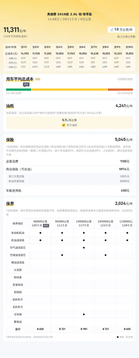 这款车的用车成本也比较合理,懂车帝平台数据显示,该车百公里油耗为5.7升,按每年行驶一万公里里程计算,燃油费用约为4801元,年度商业保险约4380元,每年保养费用约1648元,年均综合用车成本10829元,用车成本在同级别车型里面属于比较低的。