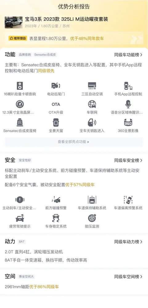 综上所述,这辆宝马3系 2023款 325Li M运动曜夜套装虽然有缺点,但是整体表现还是不错的,品牌好,知名度高,外观漂亮,内饰豪华,配置丰富,科技感爆棚,空间大,乘坐舒适,动力强,操控好,保值率高。价格却很实惠,只有24.98万,性价比很高,值得购买。需要注意的是,此车没有检测报告,需要实地试驾和检验才能购买。