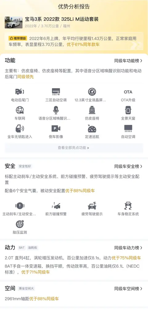 综上所述,这辆二手宝马3系 2022款 325Li M运动套装在价格、配置、动力、空间等方面都表现出色。作为一款豪华轿车,它不仅拥有出色的驾驶性能和舒适的乘坐体验,还具备较高的性价比和保值率。如果您正在寻找一款高品质的豪华轿车,那么这辆二手宝马3系无疑是一个值得考虑的选择。