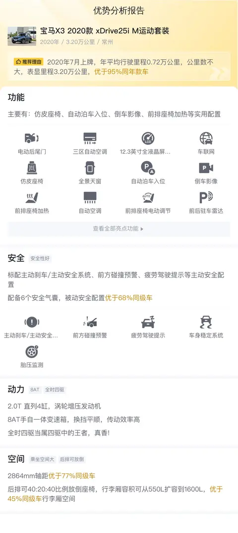 接下来,让我们聚焦这辆二手宝马X3 2020款 xDrive25i M运动套装。这车是2020年7月在常州上的牌照,跑了3.2万公里,有1次过户记录。这车当时的新车指导价是38.98万,现在二手车报价19.2万。