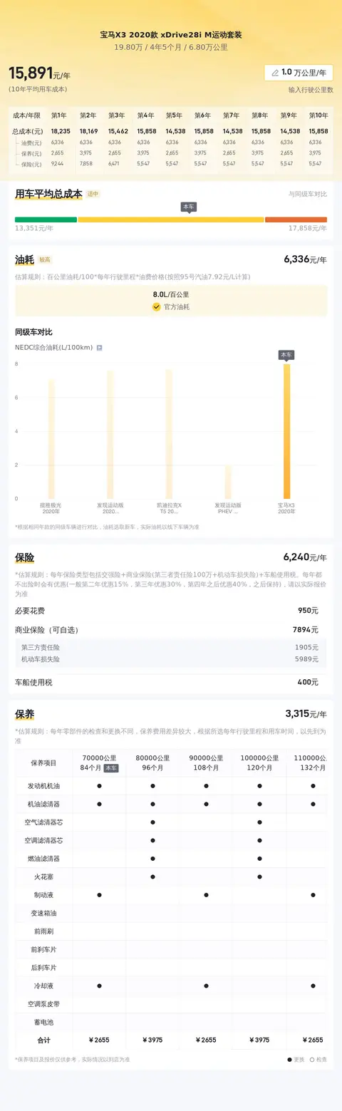 接下来,我们说说这辆车的用车成本。根据统计,该车的百公里油耗为8.0升,按一年行驶一万公里里程计算,燃油费用约为6884元,年度商业保险约5745元,每年保养费用约3331元,平均年度用车总成本约16459元,以上数据仅供参考,实际用车成本因用车场景和个人用车习惯而有所不同。