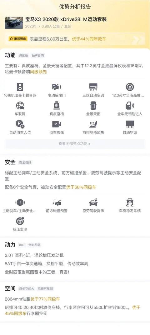 接下来我们聊聊这辆车的配置部分。宝马X3 2020款 xDrive28i M运动套装在配置上还是可圈可点的。舒适性配置方面,主要有真皮座椅、全景天窗等配置,其中电动后尾门和三区自动空调同级领先。动力方面,搭载2.0T 直列4缸,涡轮增压发动机,8AT手自一体变速箱,换挡平顺,传动效率高,全时四驱当属四驱中的王者,真香!空间方面,2864mm轴距优于77%同级车,后排可40:20:40比例放倒座椅,行李厢容积可从550L扩容到1600L,优于45%同级车行李厢空间。安全方面,标配疲劳驾驶提示,车身稳定系统,胎压监测等主动安全配置,配备7个安全气囊,被动安全配置优于94%同级车。