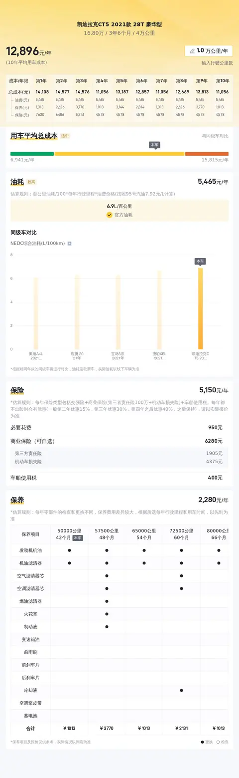用车成本方面,根据估算,这辆凯迪拉克CT5 2021款 28T 豪华型的年均综合用车成本约为1.3万元左右。这个数字仅供参考,实际费用可能会因用车强度、环境等因素有所变动。