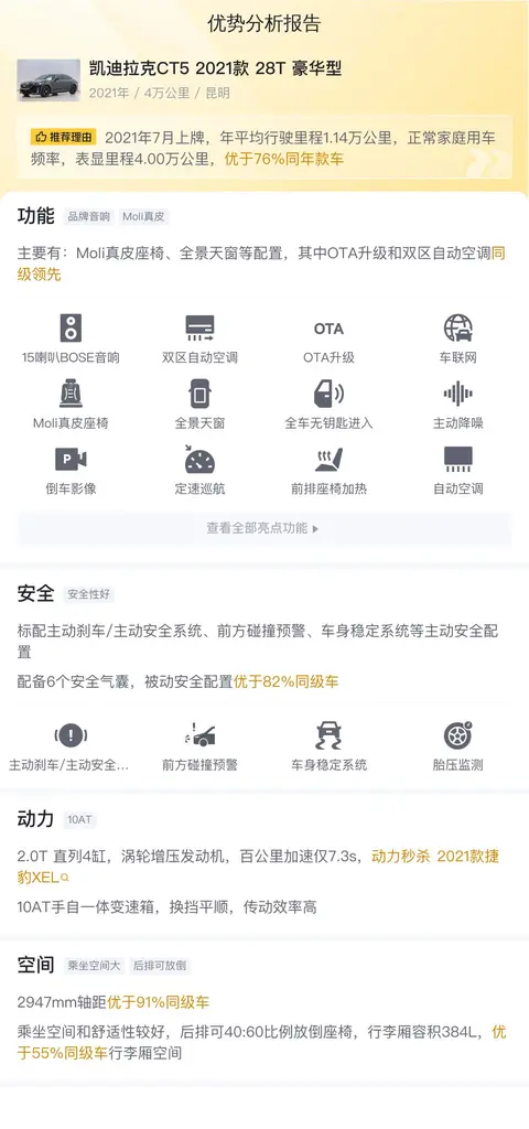 综上所述的新车含税价、用车成本、市场行情、优势分析、同款比价等数据仅供参考。在配置部分,因为二手车非标品,车辆可能会存在配置改装的情况,具体车况信息需要线下结合车辆实际情况进行综合参考。