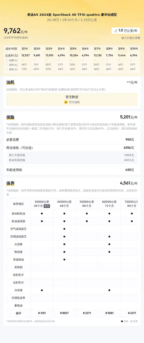 接下来咱们说一下车辆的使用成本,在挑选二手车的时候,除了购车成本,还要考量后期使用中的开支。根据估算,这辆车的10年平均使用成本约为每年1.4万元。但值得注意的是,这一费用会随着车辆使用年限的增加而有所降低。