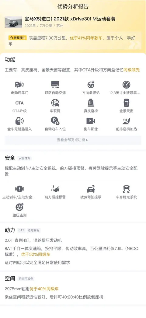 宝马X5(进口) 2021款 xDrive30i M运动套装是一款集豪华与性能于一身的SUV车型。它在动力、操控、舒适性以及智能互联等方面都有着出色的表现,是一款值得推荐的中大型SUV。而这台二手宝马X5(进口) 2021款 xDrive30i M运动套装整体车况不错,行驶里程仅为7万公里,且未经过过户,新车指导价为69.99万元,而现在仅售41.88万元,性价比非常高,值得考虑。