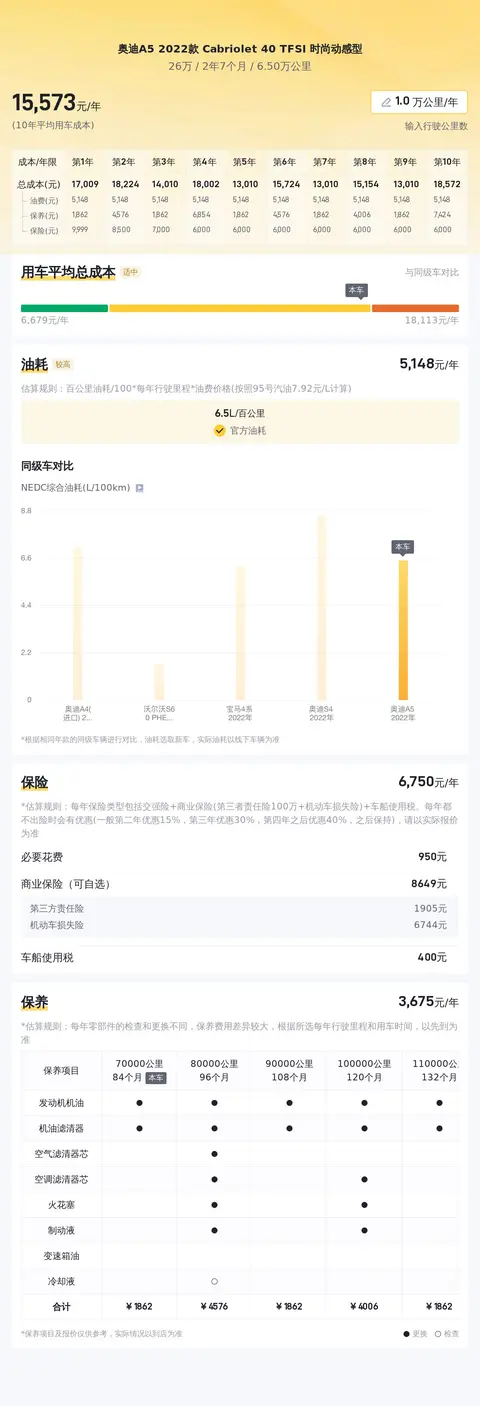除了市场行情,买家往往还很关心这辆车的用车成本和使用性价比。为此,我们估算了一下这辆车的年均综合用车成本,供您参考。