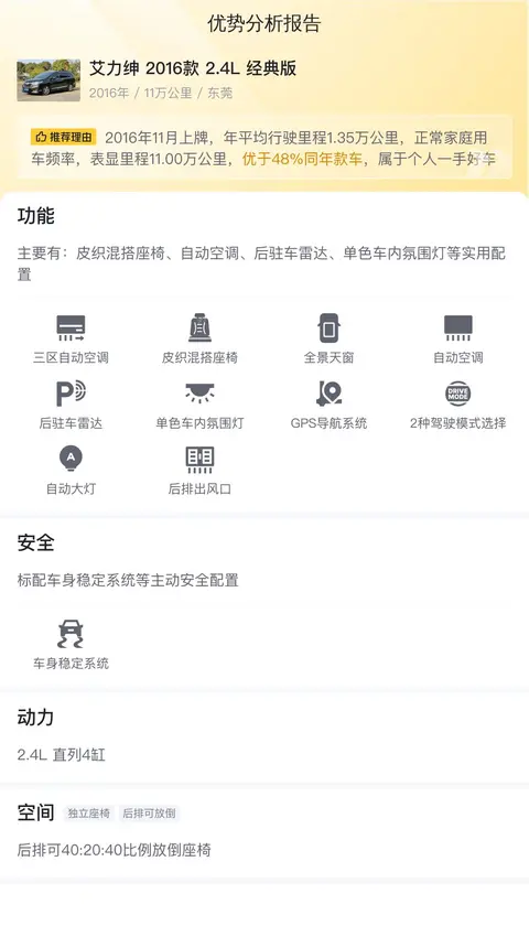 综上所述的新车含税价、用车成本、市场行情、优势分析、同款比价等数据仅供参考。在配置部分,因为二手车非标品,车辆可能会存在配置改装的情况,具体车况信息需要线下结合车辆实际情况进行综合参考。