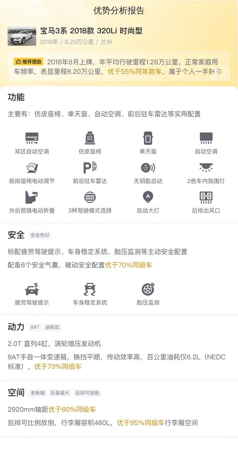 综上所述,这辆宝马3系 2018款 320Li 时尚型的用车成本、市场行情、优势分析、同款比价等数据仅供参考,车况信息需要线下结合车辆实际情况进行综合参考,由于这辆车没有检测报告,所以不能确定具体的车况如何,这一点需要注意。不过就目前的情况来看,这辆车胜在价格不高,而且品牌名气大,开出去有面子,另外空间大,适合全家出行,动力充沛,可以满足不同场景的用车需求。但是宝马3系的油耗并不低,养车成本高,而且随着年限增长,维修保养的费用也会增加,入手前要有心理准备。