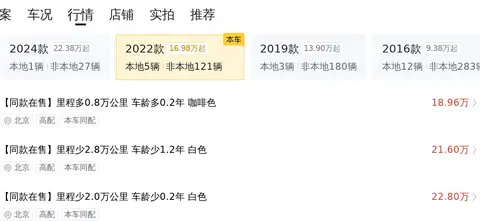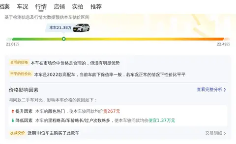 车价受很多因素影响,比如使用年限、行驶里程、车辆保养状态等,这些都会影响车辆的最终售价。这辆车在价格上还是有一定优势的,因为影响价格的因素中,里程,多于均值1.3万公里,车龄,多于均值0.3年,过户次数,多于均值1.6次,颜色,白色,这几个因素会导致价格低于同款均价,综合估价显示,这辆车目前的市场价值在19.7万至23.6万之间,而卖家的报价为21.38万。
