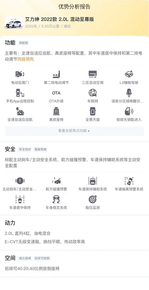 综上所述的新车含税价、用车成本、市场行情、优势分析、同款比价等数据仅供参考。在配置部分,因为二手车非标品,车辆可能会存在配置改装的情况,具体车况信息需要线下结合车辆实际情况进行综合参考。