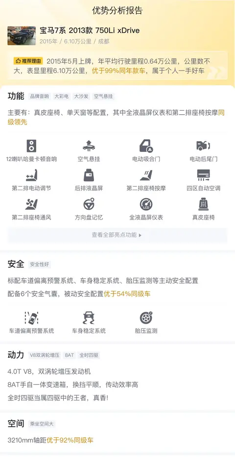 先简单了解下这款车的基本情况,该车具体版本是宝马7系 2013款 750Li xDrive,2015年5月上牌,跑了6.1万公里,黑色外观,报价33.6万,车源地跟上牌地都是成都,过户次数为0。