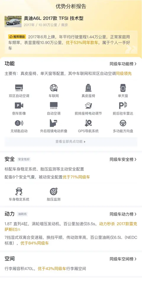 综上所述,这辆奥迪A6L 2017款 TFSI 技术型以其丰富的配置、出色的性能以及合理的售价,成为了二手车市场上的一款热门选择。它的外观保持了奥迪品牌的优雅与动感,内饰则展现了豪华与科技的完美融合。作为一款技术型车型,它在保证驾乘舒适性的同时,也兼顾了燃油经济性,符合现代消费者对节能环保的需求。无论是用于商务出行还是家庭代步,这辆奥迪A6L都能满足您的需求,是一款性价比较高的车型。