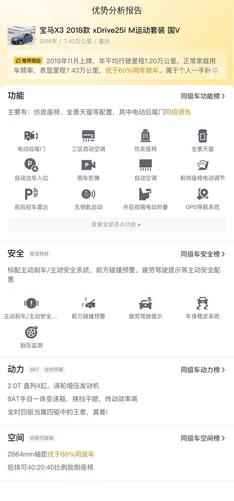 先来看看这辆二手宝马X3的基础信息,该车的具体版本是——宝马X3 2018款 xDrive25i M运动套装 国V,上牌日期是2018年11月,表显里程是7.43万公里,上牌地是潮州,车源地在重庆,车身颜色是蓝色,目前新车指导价是39.98万,而二手车报价是16.8万,至今过户0次。