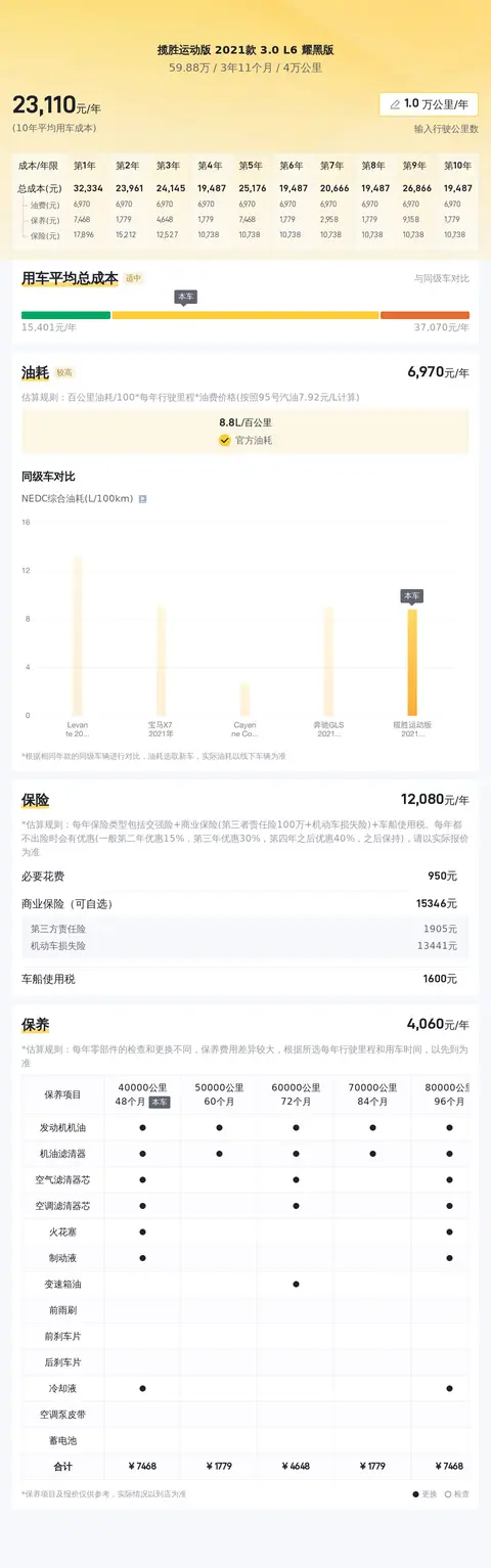 关于用车成本,根据估算,这辆车年均综合用车成本大概在每年2.3万元左右。这项花销是跟车主的实际用车场景和使用强度有直接变化的。好了,以上就是我们对这款车的全部介绍了。