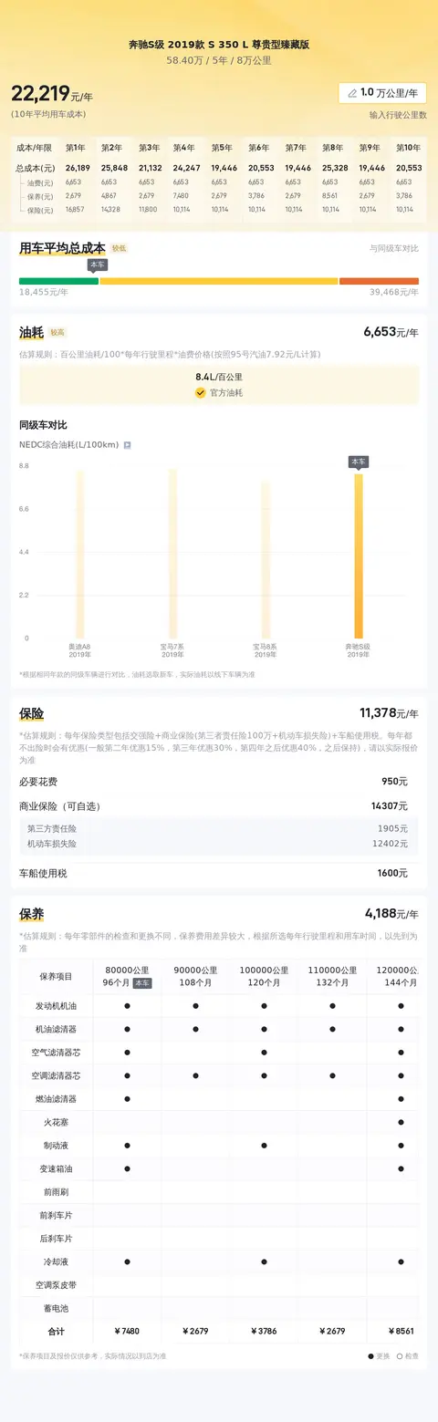 在用车成本方面,根据估算,这辆奔驰S级的年均综合用车成本约为2.2万元左右,当然具体用车成本金额还是根据车辆的实际使用情况而有所不同。