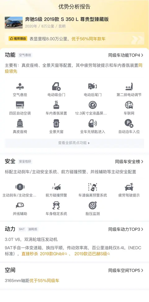 下面我们简单分析一下这款车的动力、空间和功能方面的表现。首先,3.0T V6,双涡轮增压发动机,9AT手自一体变速箱,换挡平顺,传动效率高,百公里油耗仅8.4L(NEDC标准),直接秒杀2019款Ghibli、2019款迈巴赫S级。其次,3165mm轴距优于55%同级车,至于空间有多大,建议您实地体验一下。最后,这款车配备的12.3英寸全液晶屏仪表和车内香氛装置更是同级领先,驾驶体验杠杠的!