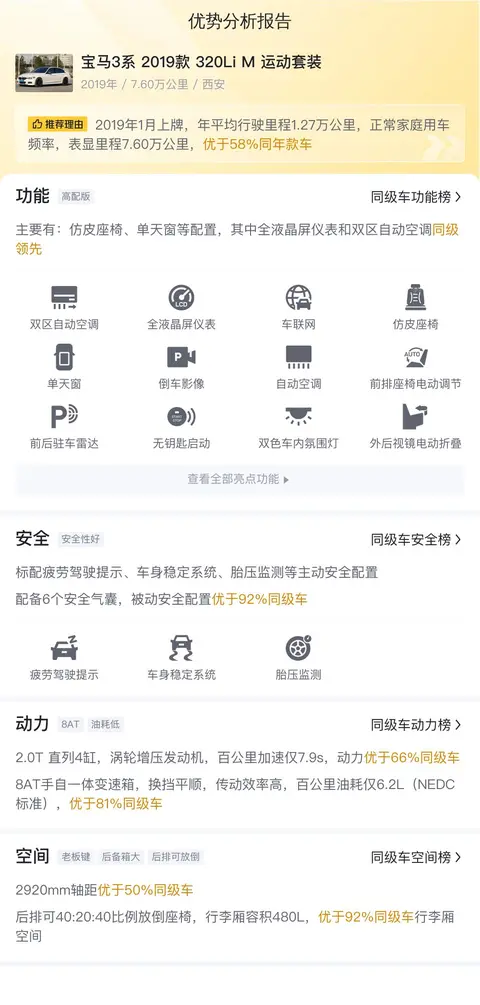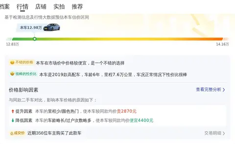 该车于2019年1月上牌,上牌地与车源地均为西安,表显里程7.6万公里,白色车身,有1次过户记录,国六排放标准。新车指导价33.98万元,现二手车报价12.98万元。