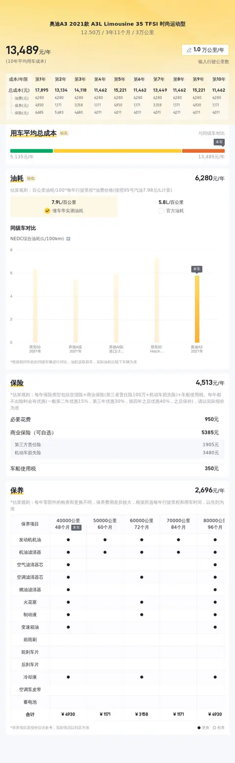 根据估算,这辆车年均综合用车成本大概在每年1.3万元左右。不过这项花销跟车主的实际用车场景和使用强度有着直接关系,所以会有所浮动。