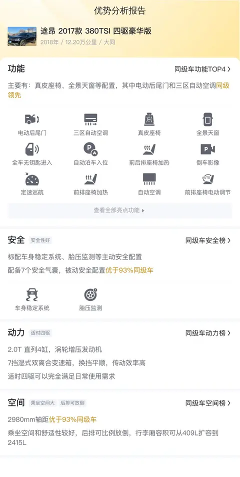 综上所述的用车成本、市场行情、优势分析、同款比价等数据仅供参考,车况信息需要线下结合车辆实际情况进行综合参考,不过从本文介绍的车辆基本信息、配置、市场行情、用车成本、优势和缺点等方面来看,这辆途昂 2017款 380TSI 四驱豪华版在二手车市场还是具备不错的性价比的,如果您正好在寻找一辆空间大、坐着舒服的中大型SUV,那么或许它可以成为您的备选之一。