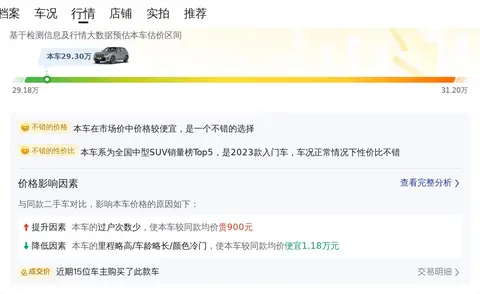 车价受车龄、里程、过户次数等因素影响较大。这辆车的里程,多于均值0.9万公里,-3200元,车龄,多于均值0.6年,-8000元,过户次数,少于均值0.2次,+900元,颜色,黑色,-585元。这些综合影响结果都会反映到车价中。