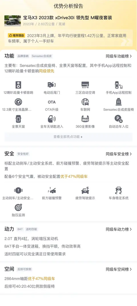 今天我们要介绍的这款车是宝马X3 2023款 xDrive30i 领先型 M曜夜套装,这辆车的上牌地是芜湖,上牌日期2023年3月,表显里程2.6万公里,新车指导价44.39万,二手车报价29.3万,车身颜色黑色,排放标准国VI。过户次数0次。