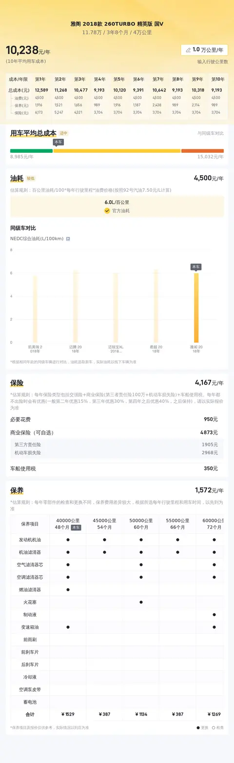 在用车成本方面,根据估算,这辆车的年均综合用车成本约为10173元,这包括了油费、保养费和保险费等。但实际费用可能会因个人驾驶习惯、用车频率和市场价格等因素而有所不同。