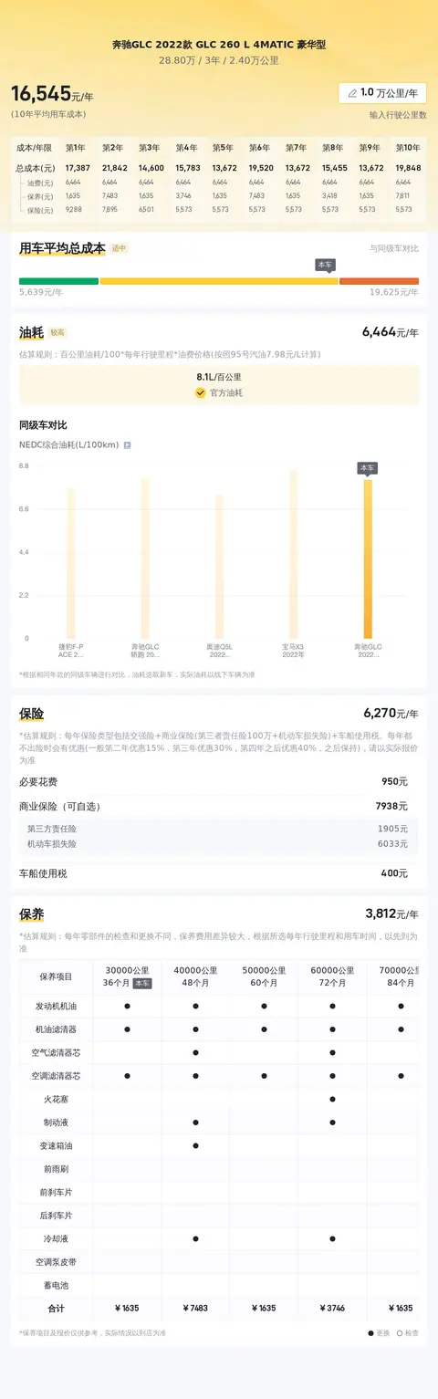 接下来,我们来探讨一下这款二手奔驰GLC 2022款 GLC 260 L 4MATIC 豪华型的用车成本。首先,我们来看看它的燃油经济性。根据官方数据,这款车型的NEDC综合油耗为8.1L/100km。假设每年行驶里程为2万公里,当前油价按8.02元/L计算,每年的油费支出约为16,040元。接下来,我们来谈谈保险费用。预估每年保险费用约为6,888元,其中包括交强险、商业险和车船使用税。最后,我们还需要考虑保养费用。预计每年的保养费用约为4,148元。综上所述,这款二手奔驰GLC 2022款 GLC 260 L 4MATIC 豪华型的年均综合用车成本大约为27,076元。需要注意的是,实际用车成本可能会因个人驾驶习惯、用车频率和地区差异等因素而有所不同。在购买二手车时,请务必结合车辆实际情况和自身经济状况进行综合考虑。