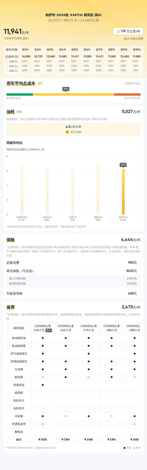 帕萨特 2020款 330TSI 精英版 国VI的10年平均用车成本是12180元/年,同级车的最低是10805元/年,最高是13798元/年,所以它的用车成本不算低。