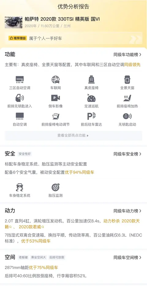 买二手车,配置要实用。这辆帕萨特 2020款 330TSI 精英版 国VI配备了真皮座椅、全景天窗等配置,其中车联网和三区自动空调同级领先。在安全配置上,标配车身稳定系统、胎压监测等主动安全配置,配备6个安全气囊,被动安全配置优于70%同级车。