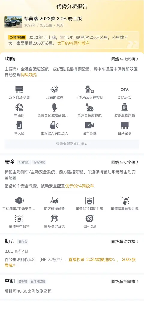 总的来说,这辆凯美瑞2022款2.0S骑士版在车况、配置、性价比和用车成本等方面都表现出色。如果您正在寻找一款性能可靠、配置丰富且性价比高的中级车,那么这辆车绝对是一个值得考虑的选择。