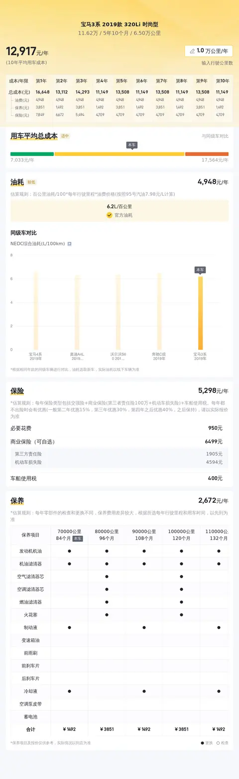 使用成本方面,这款车的百公里油耗为6.2升,按一年行驶2万公里计算,燃油费用约为11166元,每年保险费用约4688元,保养费用约4158元,年均使用成本约19999元,实际费用根据使用情况而定。