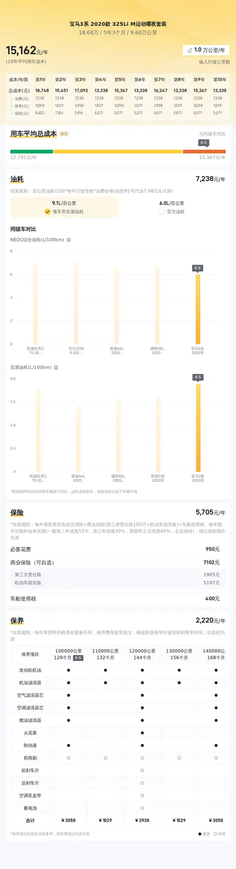 选择二手车不单是购车费用的付出,还应考虑日后的使用成本,我们综合估测该车的使用成本在15593元/年,当然这个跟车主日后使用时的具体情况不同会略有差异。