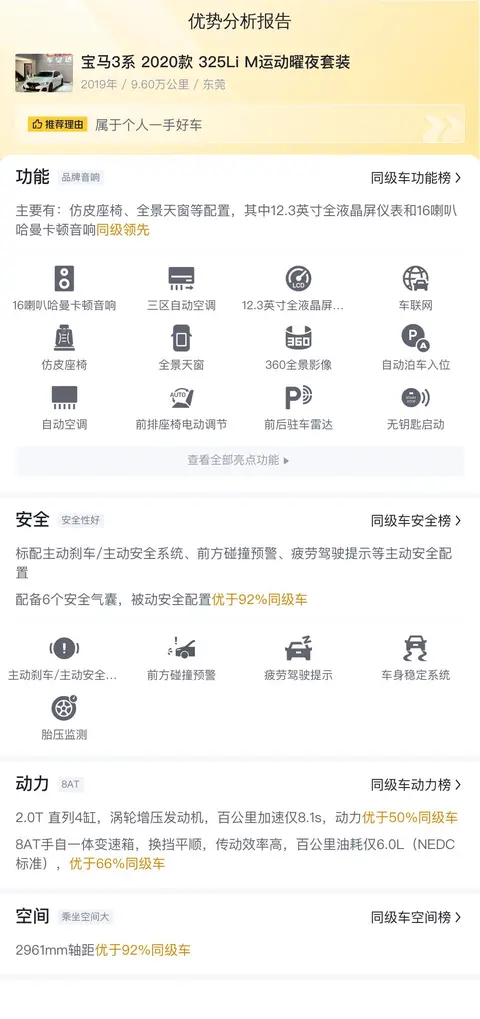 综上所述,宝马3系2020款325Li M运动曜夜套装在动力性能、内部空间、舒适性以及安全性等方面均表现出色。作为一款运动豪华轿车,它在保留宝马品牌运动基因的基础上,也更加注重日常使用的便利性和舒适性,是一辆既适合驾驶又适合乘坐的轿车。希望我们的分析能够帮助您更加全面地了解这款车的整体状况。在做出购买决策之前,请务必亲自查看车辆,并与可信的车商或销售人员沟通,以确保您所获得的信息准确无误,并且始终将您的安全与满意度置于首位。
