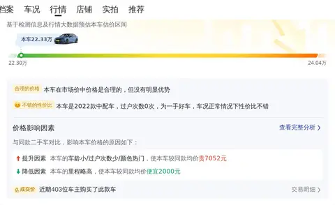 先让我们来了解一下这辆车的基本信息,该车上牌日期为2022年7月,表显里程4.9万公里,车源地和上牌地均为贵阳,车身颜色为白色,新车指导价34.53万,二手车报价22.33万,过户次数0次。