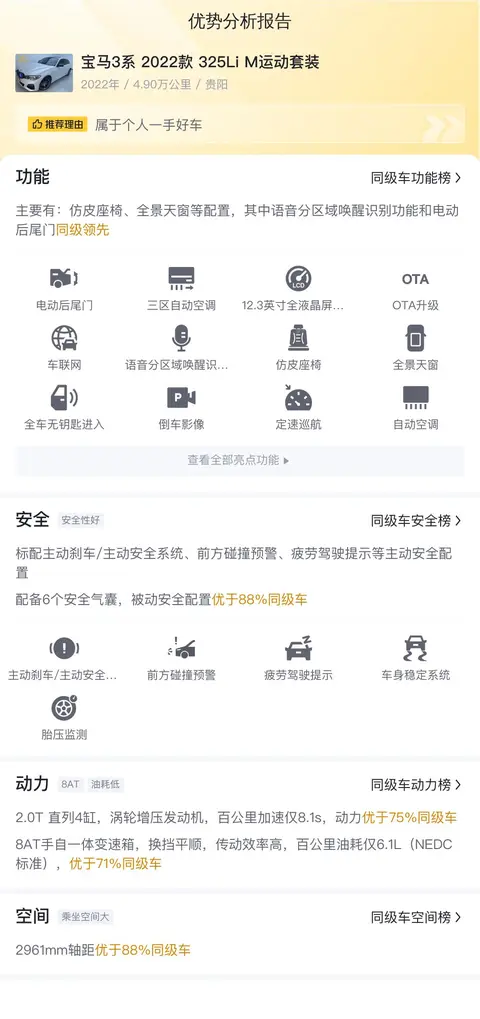BBA作为一线豪华品牌,旗下走量的车型宝马3系(图片|配置|询价)、奔驰C级、奥迪A4L,拥有着庞大的客户群体,这些车型在全国的销量基本都进入了前十二名,可见大家对于以上几款车型的认可程度。今天我们就为您带来一辆二手宝马3系,看看这辆车是否能让您满意。这辆车的具体版本是——宝马3系 2022款 325Li M运动套装。