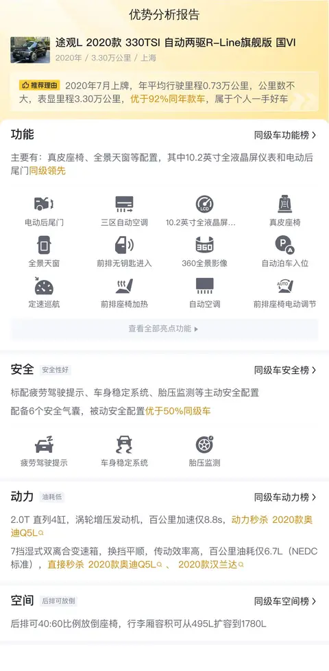 先让我们来了解一下这辆二手途观L的基本情况,该车具体版本为途观L 2020款 330TSI 自动两驱R-Line旗舰版 国VI,上牌日期为2020年7月,表显里程为3.3万公里,这车在上海地区使用,上牌地也是上海,车身颜色为黑色,目前未有过户记录。新车指导价为26.98万,目前二手车报价12.3万。