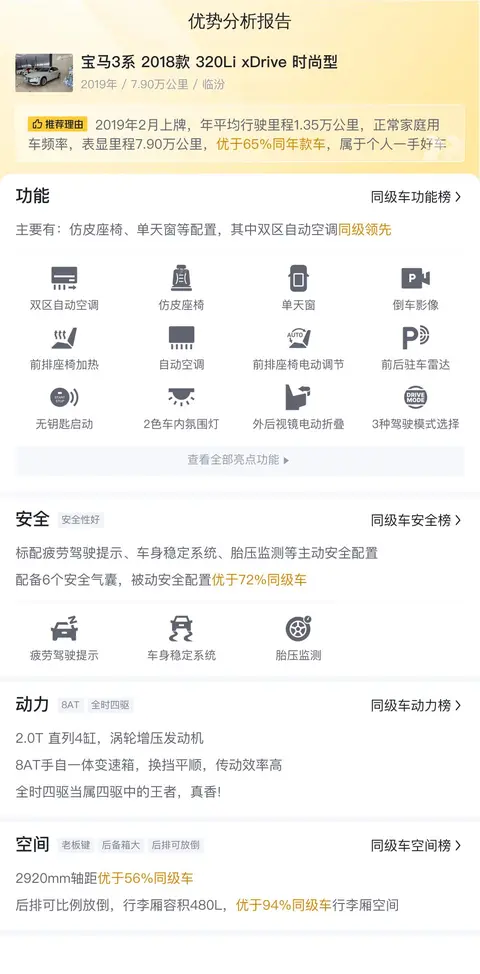 今天我们要为大家介绍的是一辆二手宝马3系,具体版本是——宝马3系 2018款 320Li xDrive 时尚型,该车搭载2.0T涡轮增压发动机,上牌地为山西临汾,上牌日期2019年2月,表显里程7.9万公里,白色车身深色内饰,新车指导价34.68万,二手车报价13.5万,过户次数0次。